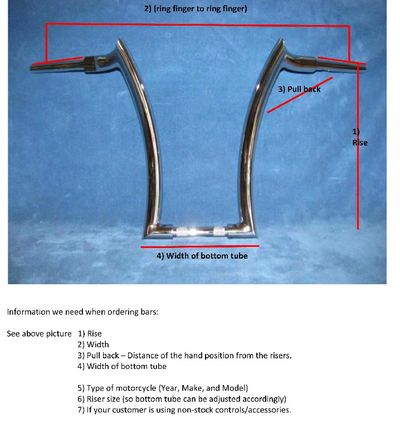 When you call please have your year, make, and model of your motorcycle. Please also let us know what style of handle bars you are interested in. We also need you to go to our "Measuring Up New Bars" page. Please let us know what Rise, Width, and Pull back you would like. We measure our bars differently than other companies.